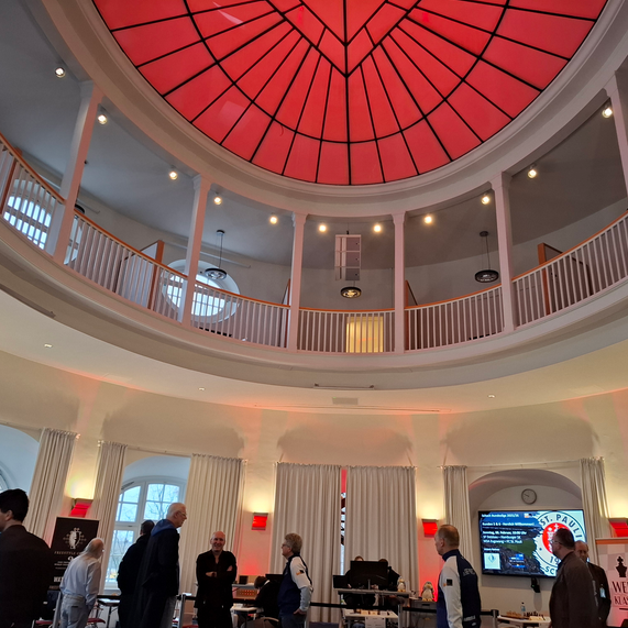 Am letzten Wochende mussten wir in der 1. Bundesliga unsere weiteste Reise antreten, und zwar nach Hamburg, zum Auswärtskampf gegen den HSK und St. Pauli. Es war klar, dass uns zwei harte Kämpfe bevorstehen, und so kam es dann auch. Gespielt wurde in der sehr repräsentativen und noblen Gerd Bucerius Law School, nahe dem Park Planten und Blomen. Hier der Blick in den Spielsaal.