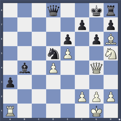 Nun kommt aber der Clou, in der Diagrammstellung steht Weiß laut Engine nur nach einem einzigen Zug forciert auf Gewinn, und zwar nach 26.Sf6+ Sxf6 27.Dxf6 Dg3. Ich fand diese Variante am Brett nicht so klar, weil sowohl Dd8 als auch Lf8 zu bedenken ist, aber Stockfish sieht es anders. Df3 ist auf jeden Fall der menschlichere Zug, und er geht kein Risiko ein.