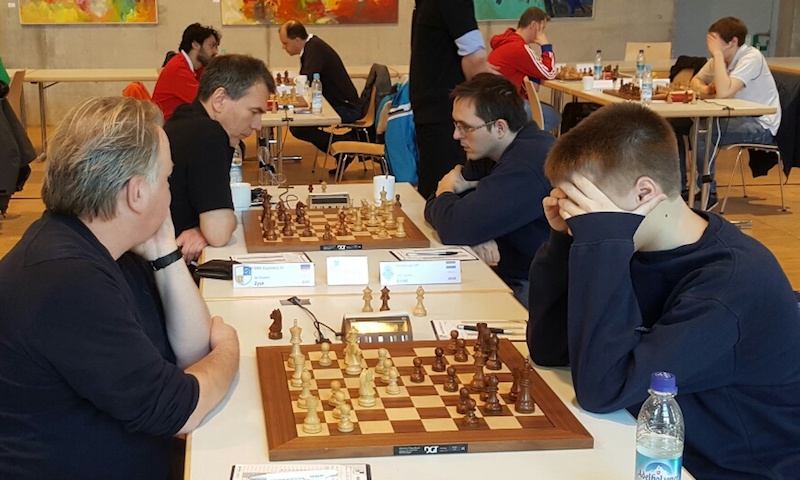 Danach wendete sich das Blatt wieder gegen uns: Gerald Hertneck verlor an Brett 3 gegen Rasmus Svane. Schweigen wir darüber... Die nächste Entscheidung führte Robert Zysk an Brett 4 herbei: Er gewann erst die Mehrqualität und dann die Partie, und zwar mit Schwarz gegen den Großmeister Sipke Ernst mit 150 ELO-Punkten mehr!
