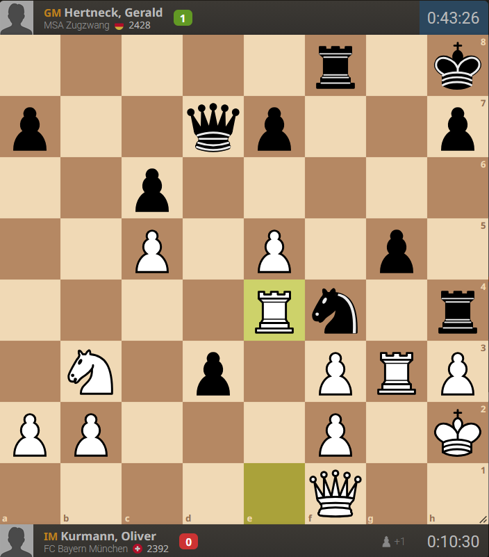 Am Samstag traten wir gegen den Lokalrivalen FC Bayern an, und ahnten, dass es ein hartes Match werden würde. Mir gelang sogar eine Glanzpartie gegen den Schweizer IM Oliver Kurmann, und Stefan Bromberger konnte sein Turmendspiel gegen GM Subelj gewinnen. Doch leider reichte das nicht ganz aus, weil drei Partien verloren gingen.