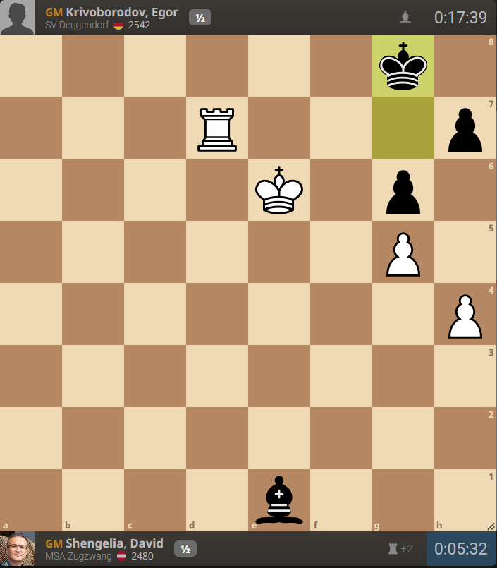 In der Partie folgte stattdessen 1. Td1?? Lxh4! (jetzt gehts!) 2.Kf6 h6! 3.Kxg6 Lxg5 mit technischer Remisstellung, weil das Mattfeld auf d8 gedeckt ist. Das Endspiel ist nur studienartig zu gewinnen, das muss man dazu sagen. Selbst auf der Rückfahrt im Auto war den Großmeistern nicht klar, ob Weiß diese Stellung forciert gewinnt oder nicht. Das Endspiel wird übrigens auch in der Endspieluniversität von Dvoretzky untersucht.