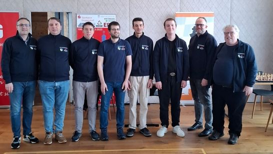 Im Bild: GM Shengelia, GM Kunin, GM Kjartansson, GM Bromberger, GM Costa, IM Baydetskyi, GM Eljanov, Käptn GM Hertneck