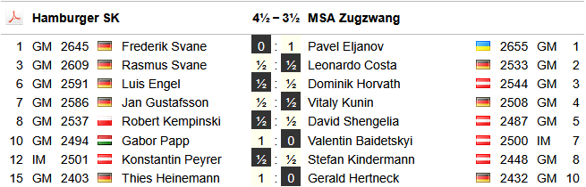 Ich hatte stark aufgestellt, denn in unserer Tabellensituation zählt jeder Punkt, und so traten wir mit 7 Großmeistern und einem Fast-GM (Valentin ist noch IM und hat 2500 Elo) an. Am ersten Tag spielten wir übrigens gegen die "halbe" Nationalmannschaft, nämlich die beiden Svanes und den Bundestrainer GM "Gusti". Und parallel bot übrigens Deizisau mit GM Blübaum und GM Kollars weitere Nationalspieler auf.
