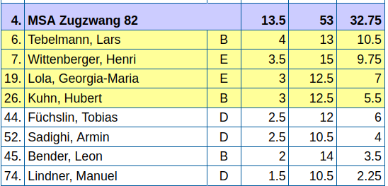 In Gruppe D (TWZ 1601-1750) landeten Tobias und Armin jeweils mit drei Remisen und einem Sieg und einer Niederlage mit 2,5 Punkten im Tabellenmittelfeld, Manuel holte 1,5 Punkte.